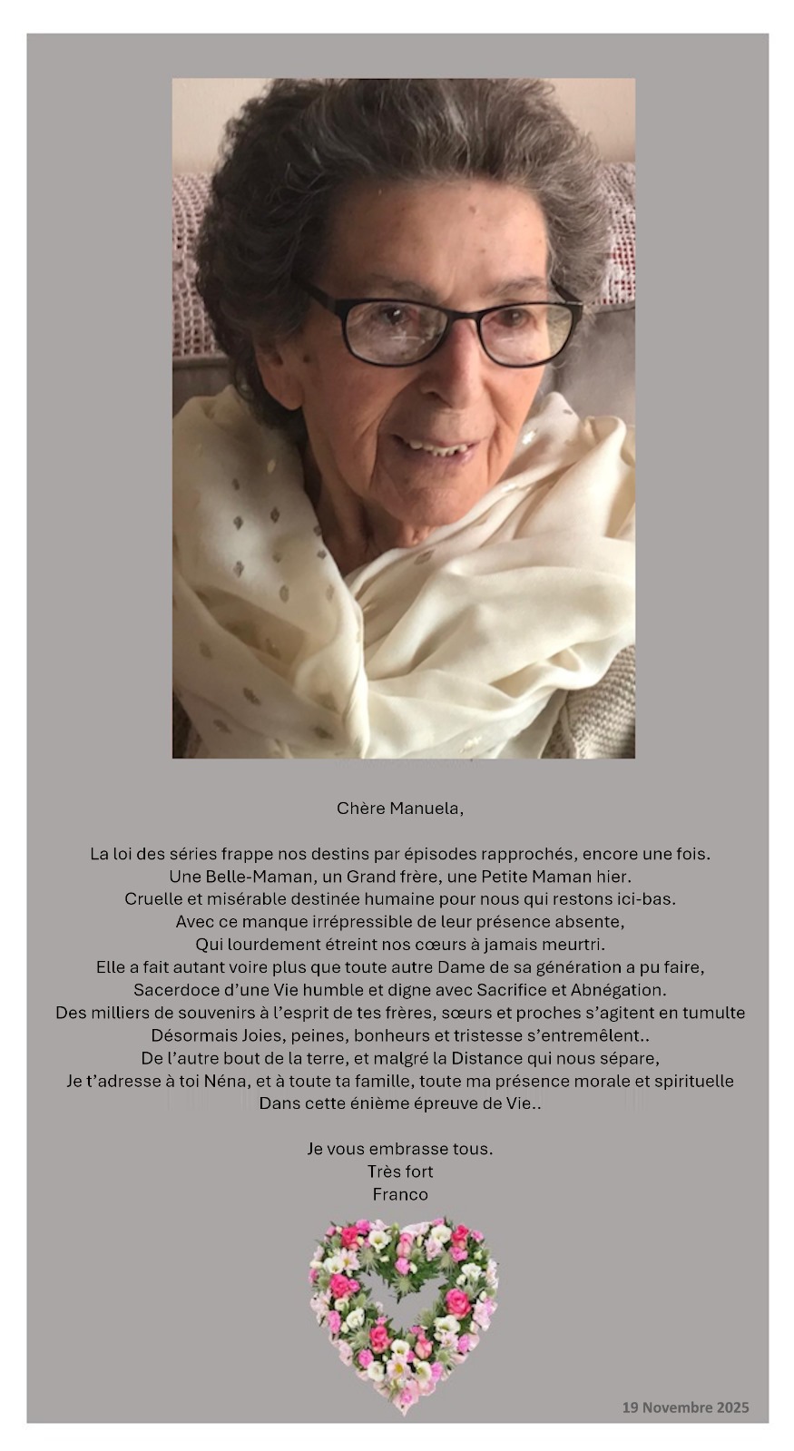 " À toute la famille Rodrigues, quelle tristesse de perdre sa maman. Une femme tellement gentille. Que de souvenirs d’enfance à la rue des Roses ou j’ai passé de bons moments avec votre maman et toute la famille. Je suis de tout cœur avec vous et partage votre peine. Je vous embrasse tous très fort. André et Jacqueline Alunno "
